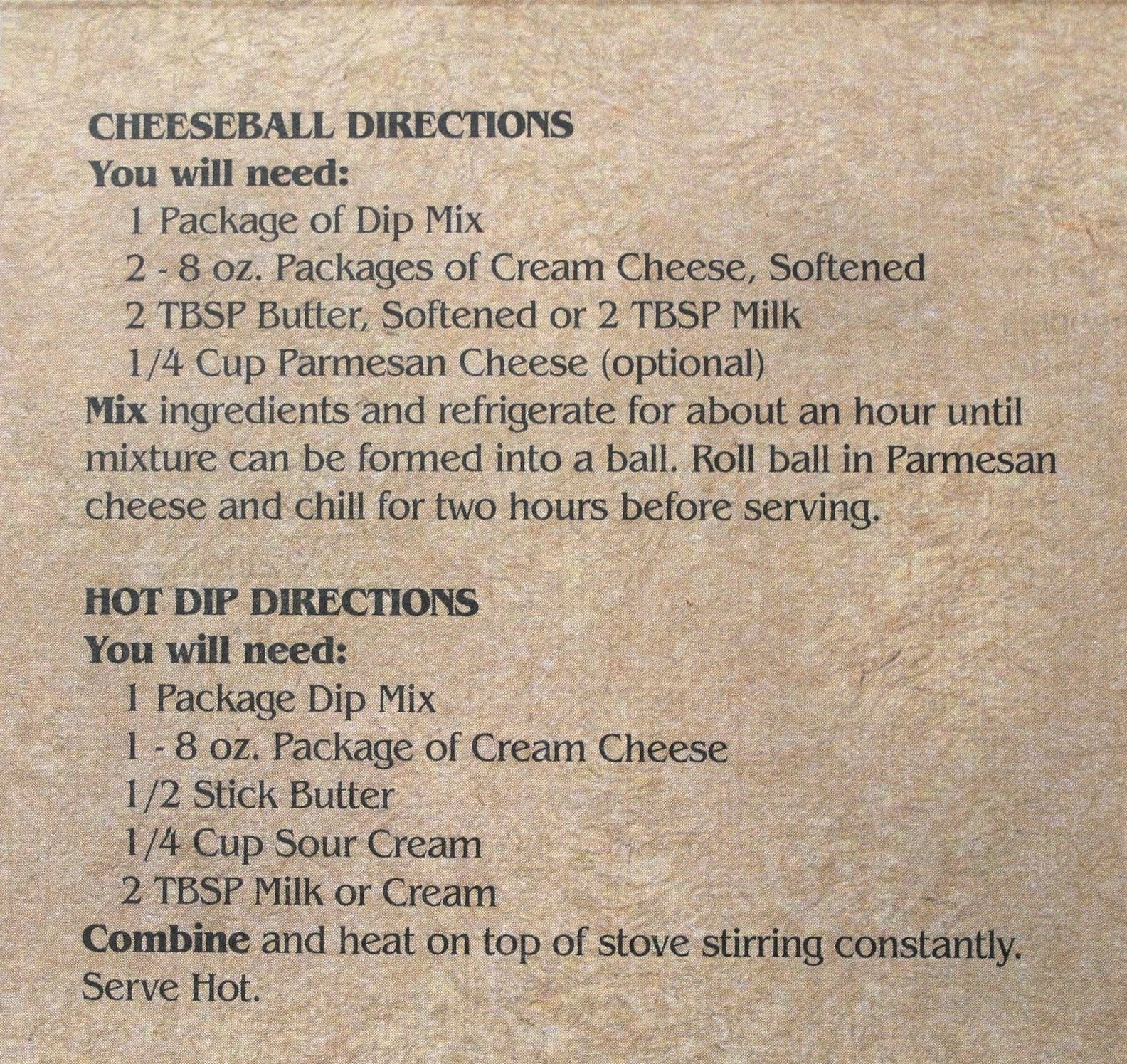 Mix Directions (makes 2 cups): 1 C Sour Cream & 1 C Mayonnaise OR 1 C Sour Cream & 8 oz pkg Cream Cheese, softened -Mix thoroughly.