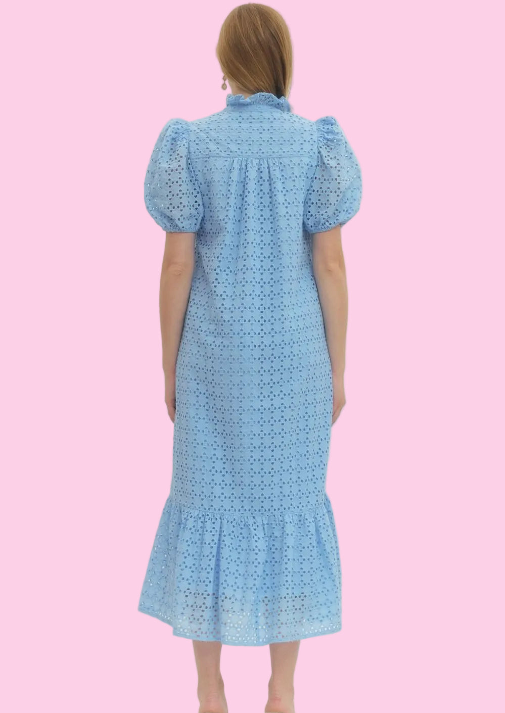 Twirl into spring with this charming light blue eyelet midi that's basically a hug in dress form. Featuring adorable short puff sleeves, a ruffled mock neck, and a playful ruffle hem, this beauty keeps things fun and flirty. The front button closure and hidden side pockets mean you're always ready for adventure—no hands needed to hold your essentials. Crafted from 100% cotton and fully lined, it's lightweight enough for warm days while staying perfectly opaque. Pure joy in woven fabric form.