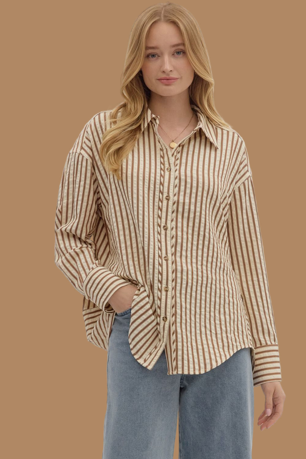 Latte Textured striped pattern long sleeve button down collar shirt featuring pleated drape hem detail at back. Unlined. Woven. Non-sheer. Lightweight.