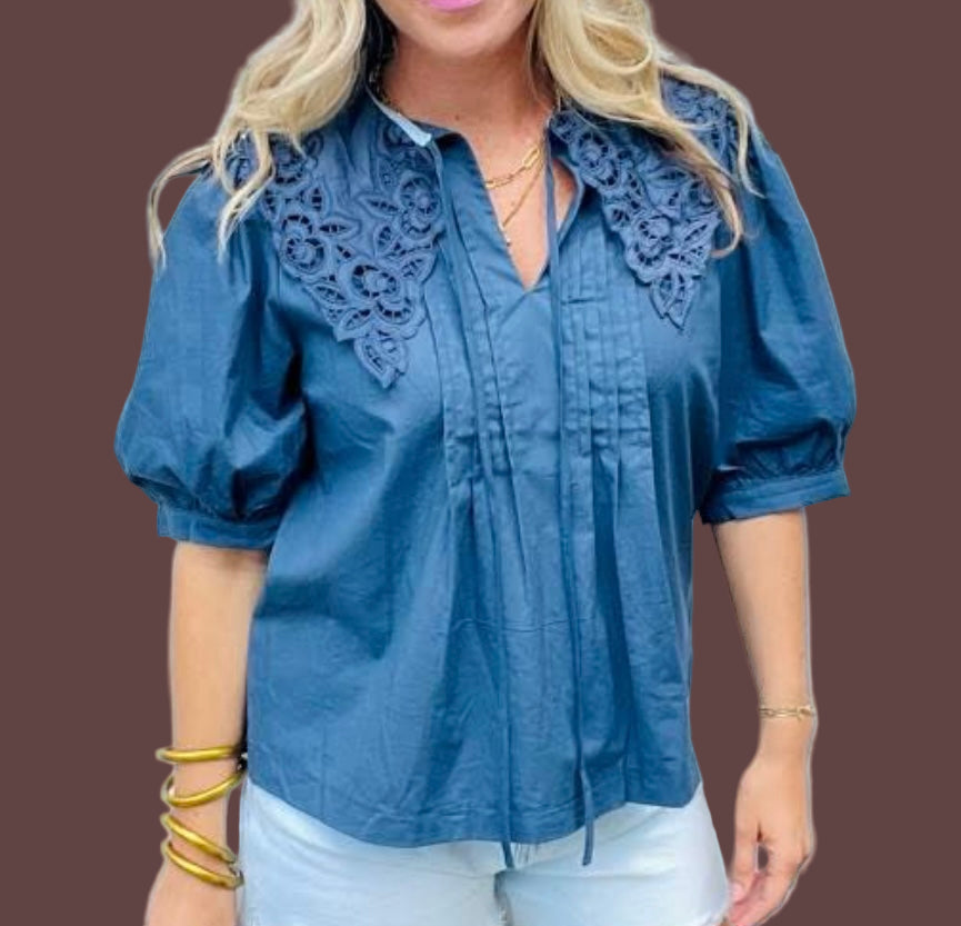 This beautifully embroidered navy collared top is great piece for going into fall. Pair it with brown pants, butter colored pants, or jeans for a great look.