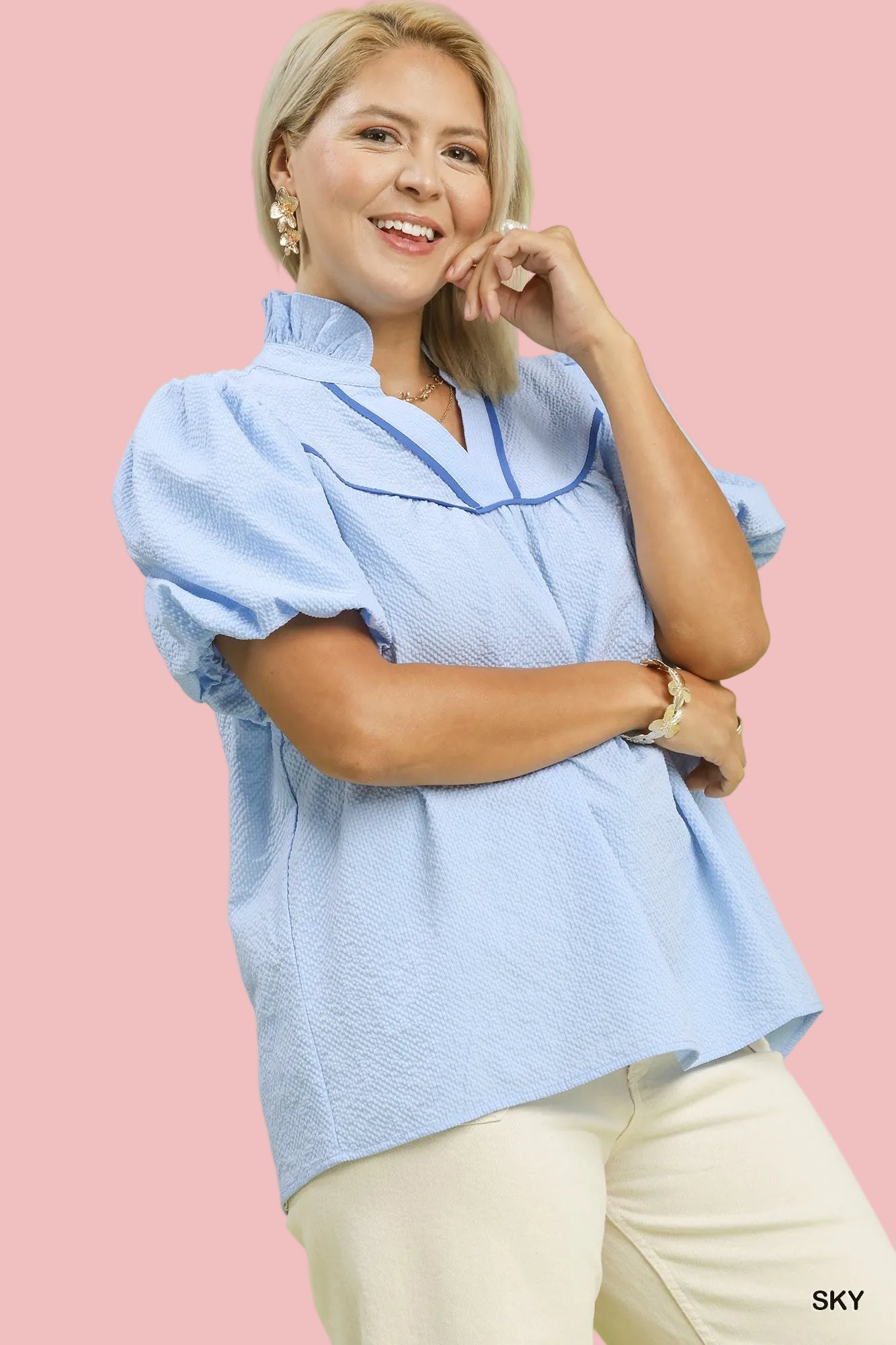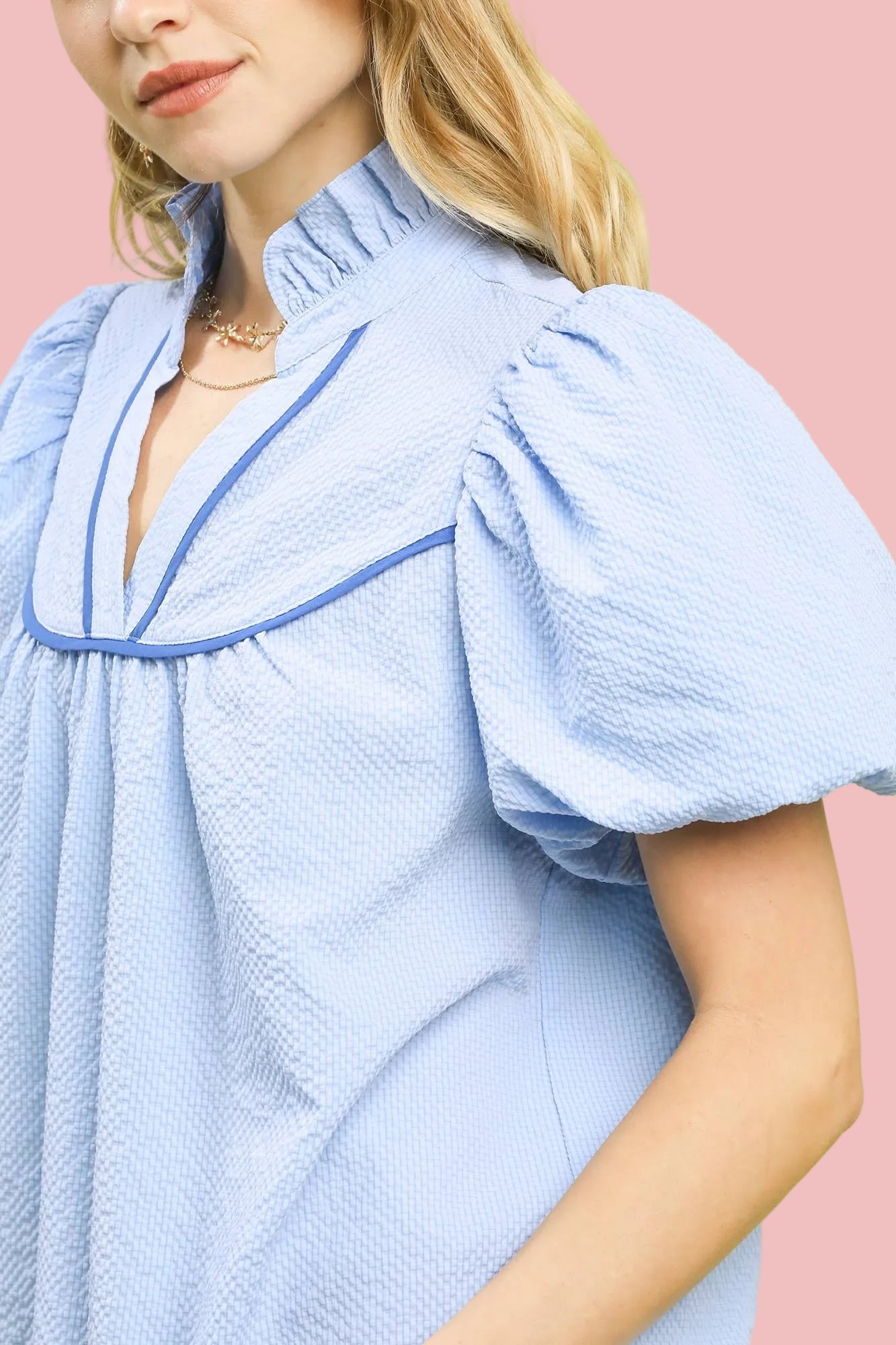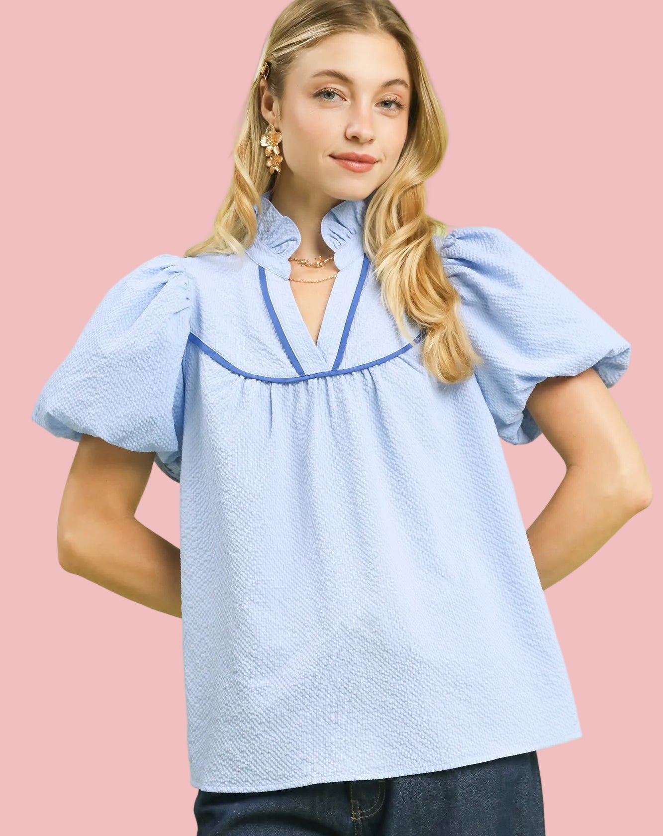Reach for the clouds in this breezy sky blue top that's anything but ordinary. Featuring a playful ruffle mock neck and eye-catching V-cut detail trimmed in contrast, this piece brings personality to your everyday rotation. The textured fabric adds dimension while puff short sleeves deliver that perfect balance of fun and flattering.